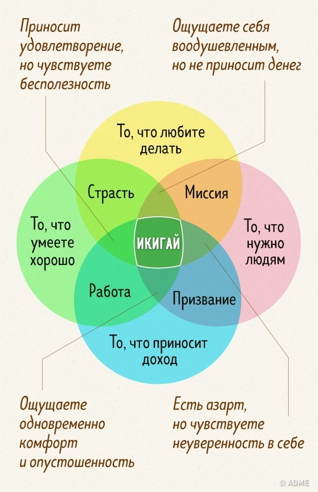 Готові? Тоді для початку дайте собі відповідь на ці питання. Те, що перетинається у відповідях і що можливо об'єднати, і буде наповнювати ваш икигай.