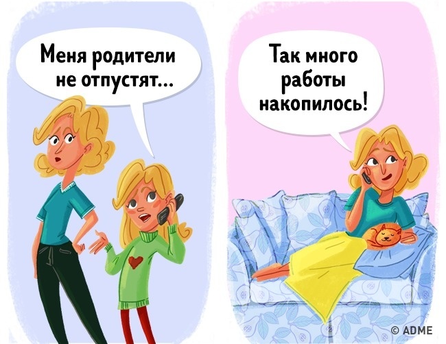 Скільки разів, будучи підлітком, ми нарікали на те, що батьки нас не відпускають? Але іноді ця історія, яка стара, як світ, працювала нам на руку, коли йти куди-небудь страшенно не хотілося. З віком ми знаходимо нові, але не менш банальні причини — багато роботи або домашніх справ.