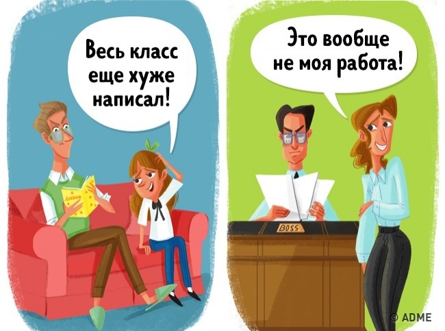 У дорослому житті немає оцінок і класів, зате є інші способи відмазатися: ми з легкістю можемо сказати, що робота, яка нам не вдалася, повинна була виконуватися іншим відділом, і з нас нічого не візьмеш.