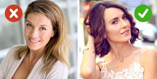 Довгі прямі волосся підкреслюють вікові зміни особи. Віддайте перевагу стильним коротких стрижок. Якщо ви не готові до кардинальних змін, то також підійдуть багатошарові стрижки, які зроблять ваше обличчя кругліше і молодше.