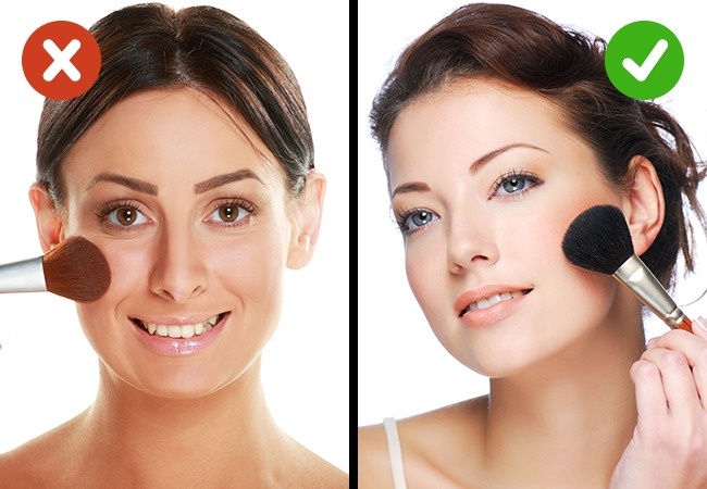 Всі багато разів чули, що рум'яна слід наносити на яблучка щік. Але це правило діє тільки для дуже молодих дівчат. З віком овал обличчя починає «плисти», і подібне нанесення рум'ян тільки підкреслить це. Краще наносити рум'яна на верхню частину скули, розтушувати лінію практично горизонтально — такий спосіб створить ефект ліфтингу.