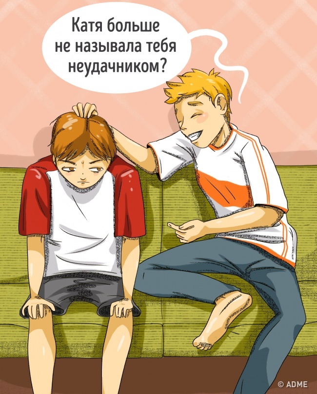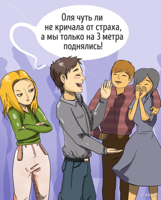Страх — це те, над чим ми зазвичай не владні. Хтось боїться павуків, хтось висоти. Жартувати над такими речами — табу. Тим більше-у великій компанії, де купа дотепників. Краще допоможіть партнеру впоратися зі страхом в складній ситуації, і, можливо, наступного разу він буде почувати себе впевненіше.