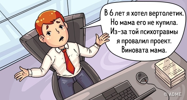 Співрозмовник виправдовує будь свій промах або бездіяльність. Активно виносить обвинувальні вироки всім навколо. Запізнився на побачення — таксист подав авто аж на 2 (!) хвилини пізніше. Позбавили премії — через підступи злого начальника. У співробітниці Каті зарплата вище — явно не за трудові заслуги...