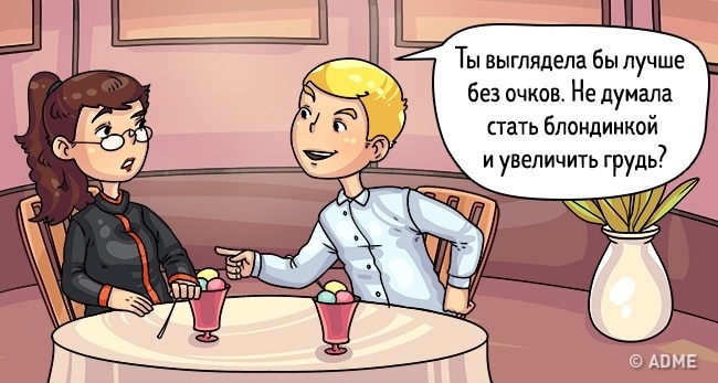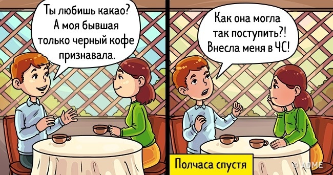 Попередні стосунки — тема сама по собі слизька. А вже якщо побачення перетворюється на сеанс психоаналізу, адекватність кавалера викликає сумніви. Швидше за все, він «застряг» в невдалому романі. Невже ви готові годинами слухати скарги на колишню або стати жилеткою?