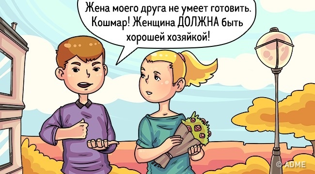 Точніше, довгі міркування про «справжнє» чоловіче/ жіноче призначення. Звичайно, якщо в майбутньому ви хочете обмежитися роллю хранительки домашнього вогнища — дерзайте. Якщо ж прагнете до рівноправності у відносинах, краще тримайтеся подалі від шанувальника домострою.