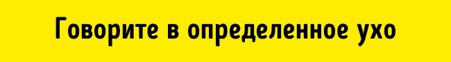 Ще один трюк, який допоможе змусити людину виконати ваше прохання. Виявляється, дуже важливо, в яке вухо ви говорите. Фрази, почуті правим вухом, впливають на логіку співрозмовника, а лівим вухом — на почуття. Це означає, що просити, говорити про роботу і справи краще, стоячи праворуч від людини. Зліва від співрозмовника признавайтеся в коханні і одаривайте компліментами.