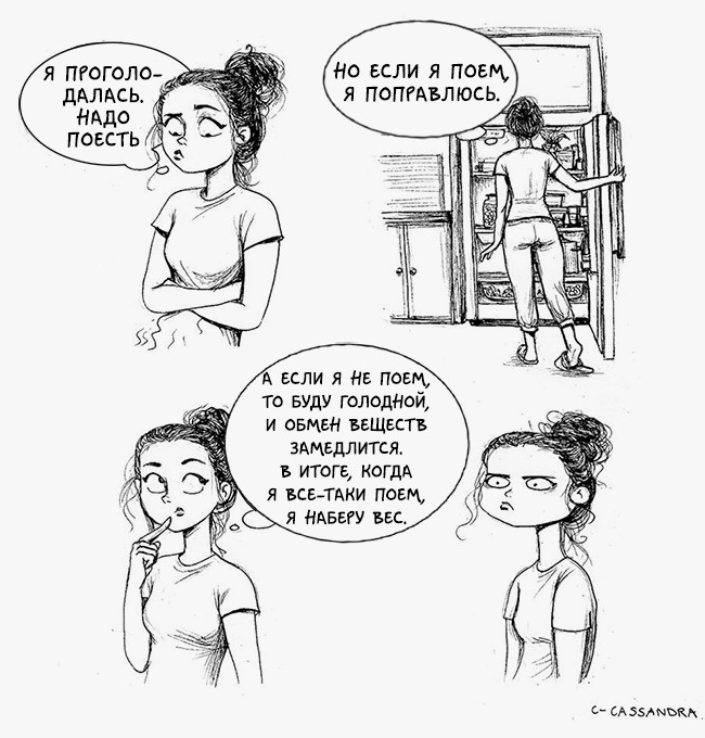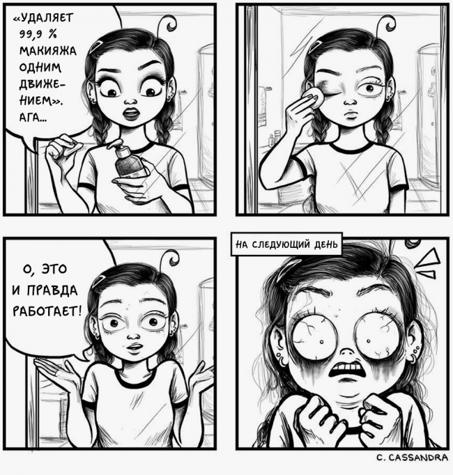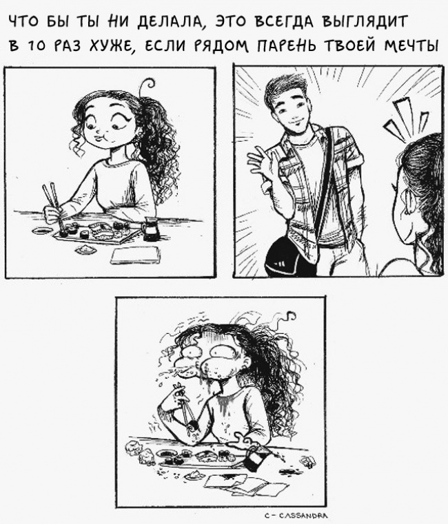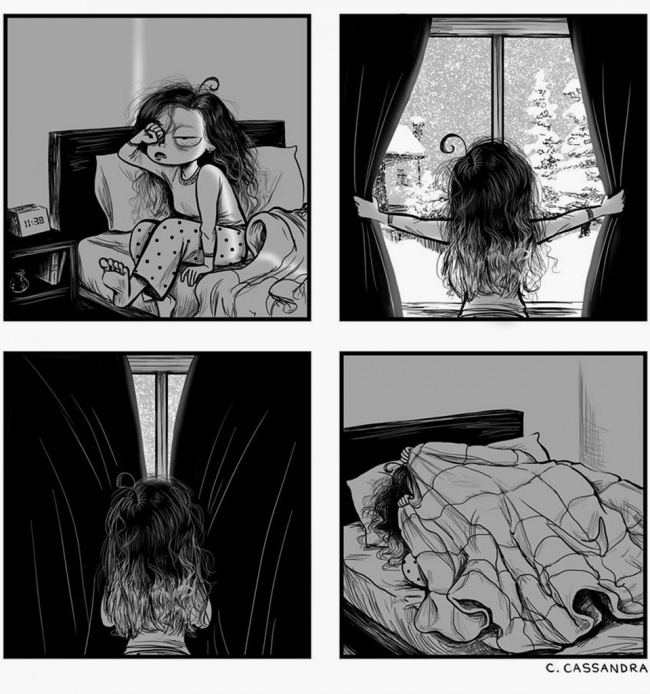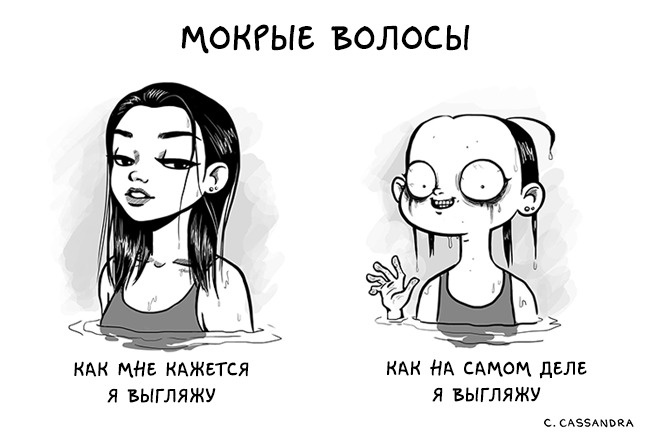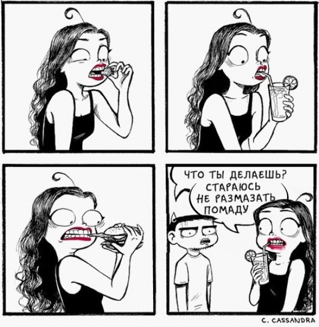 Румунська художниця Кассандра Калин (Cassandra Kalin) створює комікси, в яких презабавно зображує щоденні жіночі проблеми. «Мені дуже подобається сміятися над своєю незручністю, над своїми безглуздими проблемами», — пише вона. Погодьтеся, що з такою філософією і правда легше крокувати по життю.