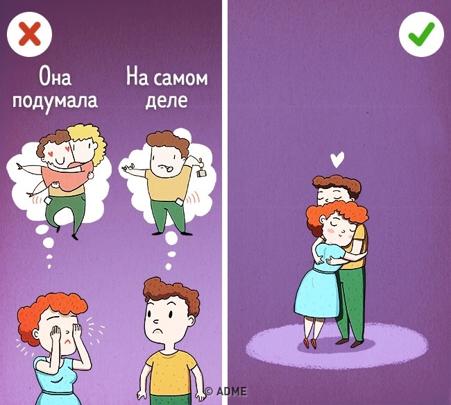 Не приписуйте дій партнера свої домисли, які можуть бути далекі від дійсності. Це може тільки спровокувати новий напад сварки. Уточніть мотиви поведінки свого партнера.