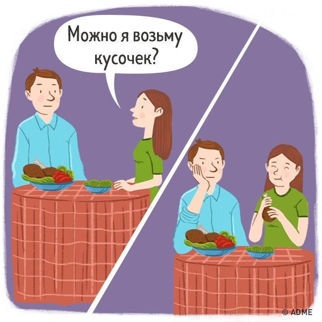 Ні! І не тому, що шкода, а тому, що він десять хвилин тому пропонував вам замовити точно такий же стейк, але ви відмовилися. І всі ми знаємо, що наше «пригоститися» легко перетворюється в «ненавмисно з'їсти дві третини порції».