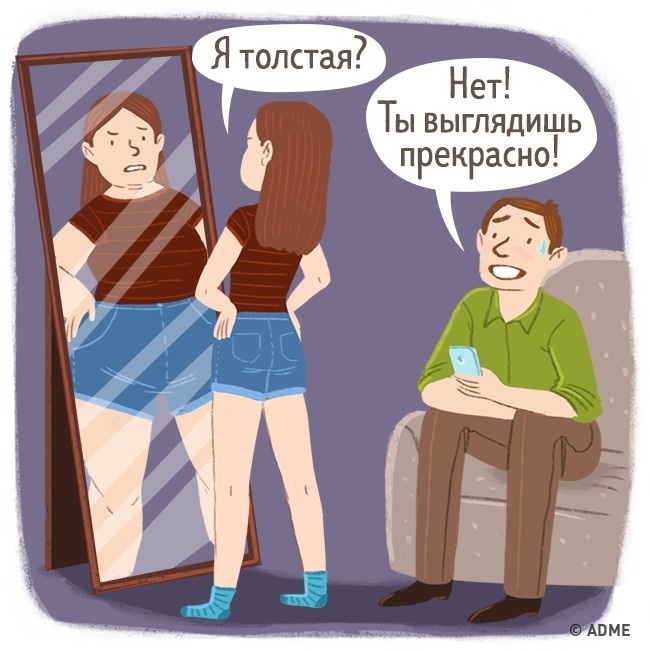 Перше, що приходить хлопцям на розум після такого питання: «Це пастка!». Навіть якщо дівчина дійсно красива, відповісти «Так!» означає підписати собі смертний вирок. Але справа в тому, що навіть будучи закоханим, чоловік не втрачає зір і здатність адекватно оцінювати те, що бачить. І в цьому немає нічого поганого, але правду вам все одно ніхто не скаже. А кому подобаються питання, свідомо передбачають брехня у відповідь?