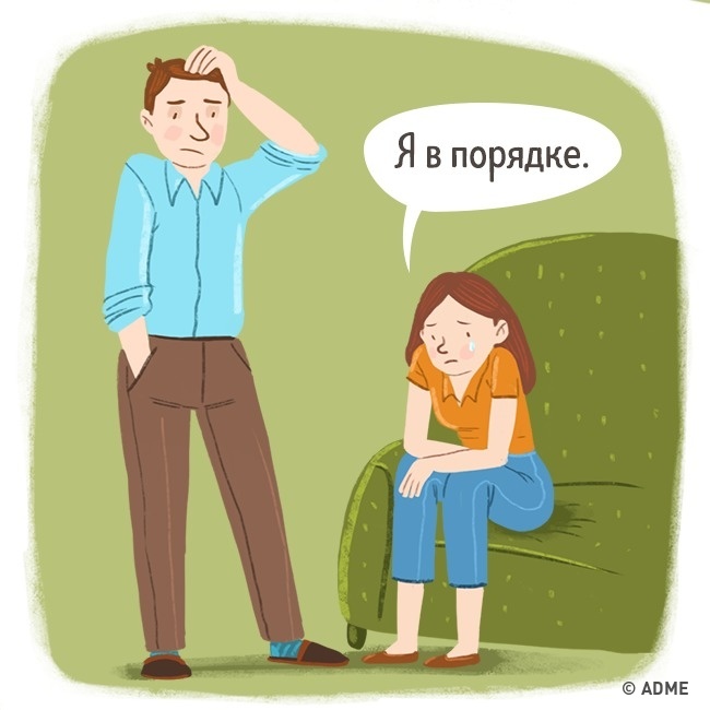 Найчастіше фраза «Я в порядку» має на увазі що завгодно, але тільки не її пряме значення. Якщо вам дійсно погано, просто скажіть це. Щирість принесе набагато більше користі вам обом і відносин в цілому.