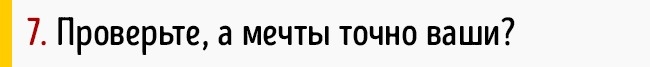 Перш ніж почати шлях до мети, Барбара рекомендує перевірити істинність ваша мрія. Уявіть, що ви вже добилися того, чого хотіли. Відчуйте це до дрібниць. Батьки, може бути, і пишалися б, а ви — щасливі? Ви стоїте на вершині Евересту, але відчуваєте радість, а лише крижаний пронизливий холод? Чи сидите за президентським столом, з тугою думаючи, яку купу документів потрібно підписати?