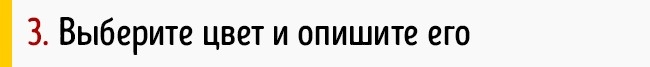Який колір вам подобається? Необов'язково, що він ваш улюблений. Пошукайте вам приємний колір в журнальних ілюстрацій або на картинках в інтернеті. А тепер уявіть, що ви і є цей колір. Опишіть його на аркуші паперу. Наприклад, «Я синій...». Який він? Спокійний або пристрасний? Сміливий або обережний?