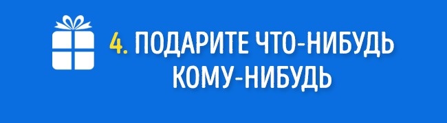 Дослідження підтверджують: процес дарування робить дарувальника більш щасливим. Крім того, вручивши людині необхідну йому річ, ви відчуєте себе потрібним, і це, мабуть, аргумент, навіть більш вагомий, ніж щастя в даний момент.