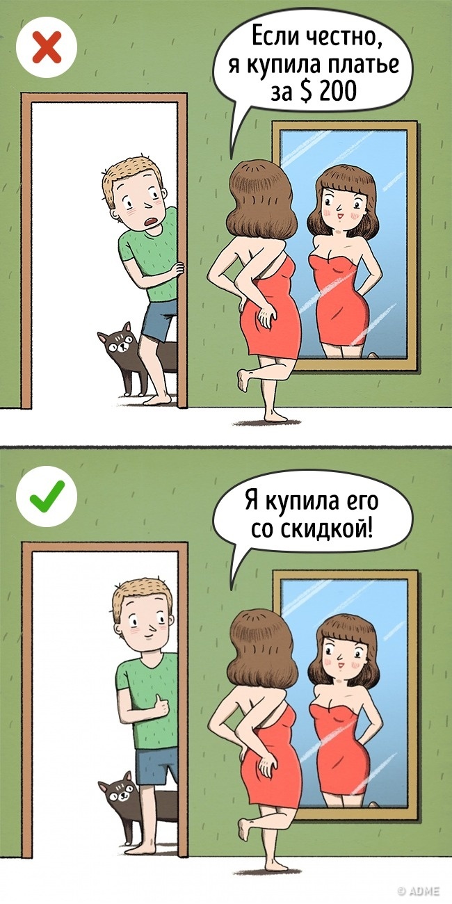 Не потрібно замовчувати про свої образи і претензії. Одного разу ця міна сповільненої дії вибухне, і тоді чекай біди. Уникайте недомовок і краще відразу говорите один одному, що вам не подобається. Будьте чесні — і ви виявите, що багато «заборонені» теми зовсім не призводять до скандалів і вирішуються мирним шляхом.