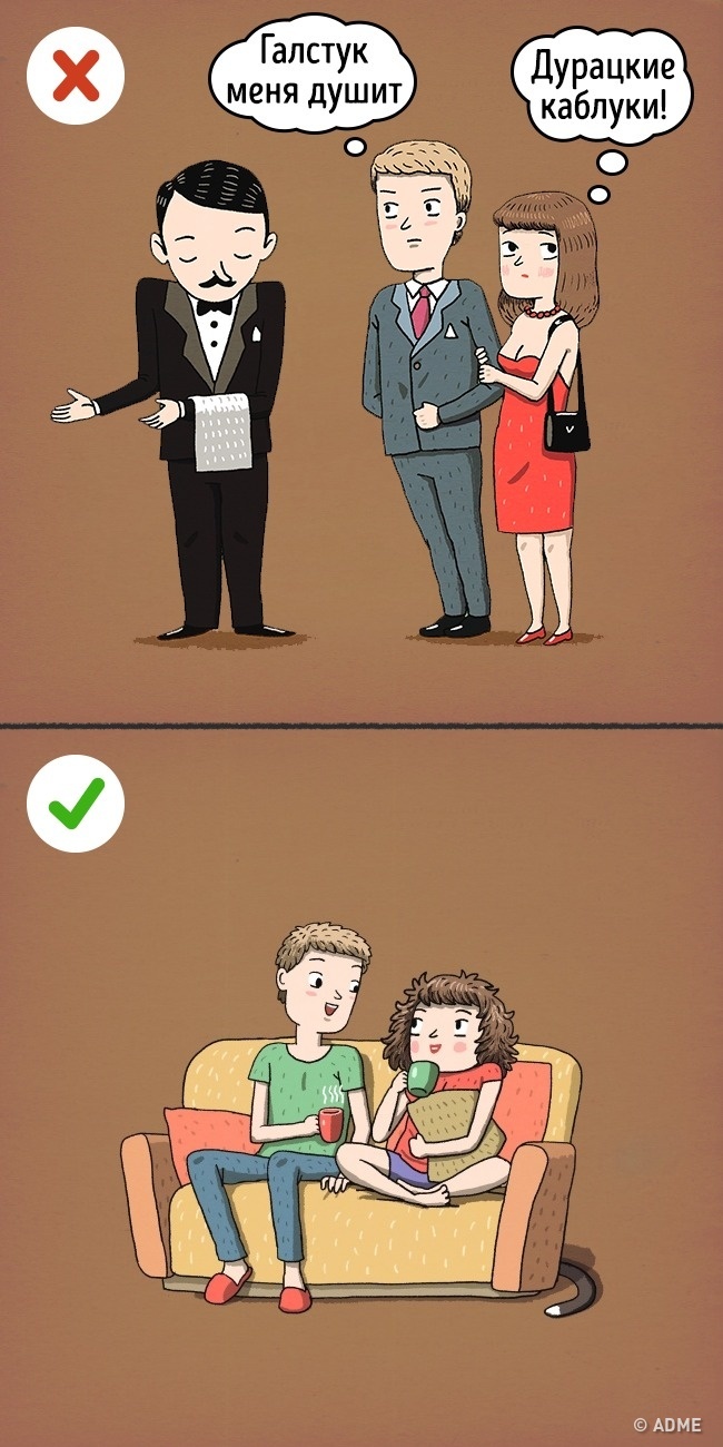 Не треба лізти зі шкіри геть, щоб підтримувати одне одного інтерес. Адже головне — це позитивні емоції. І якщо ви об'єктивно отримуєте задоволення від того, що можете разом повалятися на дивані в кінці робочого тижня, то ніхто не має права вас засуджувати.