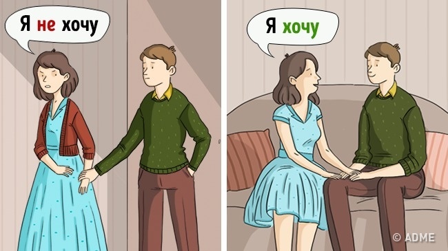 Частка «не» має властивість надавати деякими твердженнями негативний відтінок. Тому не варто вживати її, розповідаючи про те, чого ви хочете. До того ж партнеру після таких фраз складніше зрозуміти, як діяти далі, адже у нього залишається безліч варіантів поведінки.