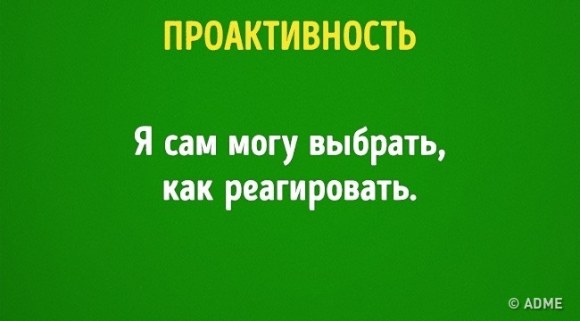 Проактивні люди беруть на себе відповідальність за своє життя і визнають, що вона залежить від їх рішень. Їх поведінка є їх свідомий вибір. І він заснований не на думці оточуючих, а на внутрішніх цінностях, які вони вибрали самі.