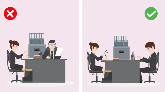 Особливо це актуально на співбесідах. Те місце, яке ви займаєте, говорить про те, як ви розумієте свою роль і роль співрозмовника в даній ситуації. Коли вам пропонують сісти, сядьте прямо і зручно, не заваливаясь вперед або назад. Якщо співрозмовник не вказав конкретне місце, краще сісти прямо навпроти нього. Постарайтеся не схрещувати руки і ноги, оскільки це може показати вашу скутість.