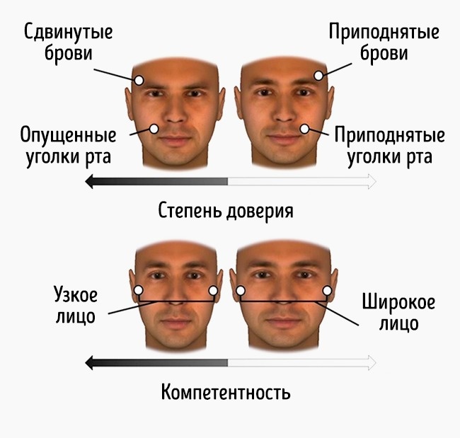 Важливі кут нахилу особи і навіть колір шкіри — ми схильні довіряти людям зі смаглявим злегка похиленою головою.