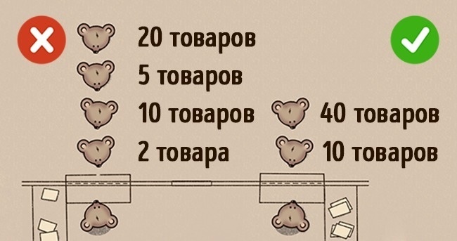 «Кожній людині потрібна певна кількість часу, щоб привітатися, розплатитися, попрощатися з касиром і покинути чергу. Це становить приблизно 41 секунду, в той час як на пробивання товарів з кошика йде в середньому за 3 секунди за одиницю товару».