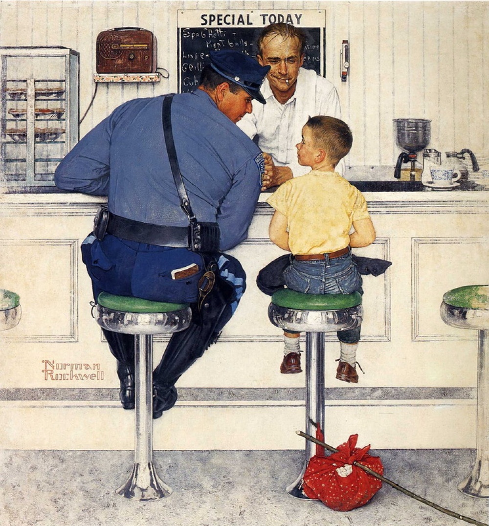 У своїх картинах Роквелл зображав ідеальну версію світу, наповнене добротою і теплом. Зазвичай сцени, де діти тікають з дому, повинні викликати занепокоєння і тривогу. Але тільки не тут — маленький втікач, який опинився в барі, оточений турботою і захищений. Сам хлопчик немов під охороною в центрі трикутника — зліва по-батьківськи до нього схилився поліцейський, в центрі добродушно посміхається бармен, а праворуч, судячи по порожній кавовій чашці, не так давно сидів ще один добрий чоловік. У світі художника жодна дитина не піддасться небезпеці, а для поліцейського немає більш серйозних справ, ніж поговорити з юним втікачем і переконати його повернутися додому.