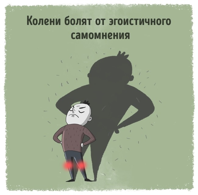 Біль у колінах, найімовірніше, є ознакою сильно роздутого «я». Коліна болять, коли ми занадто багато думаємо про себе і дуже мало про інших, коли ми твердо і безкомпромісно впевнені, що світ обертається навколо нас.