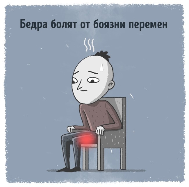 Такі болі можуть мучити людей, занадто чіпляються за передбачуваність життя і комфорт. Патологічна боязнь змін, небажання змінювати усталений порядок речей, постійний опір новому можуть спровокувати біль у стегнах.