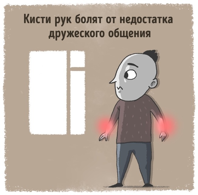 Руки болять у тих, хто давно і сильно потребує дружбу. У тих, кому не вистачає розслаблення і простого дружнього спілкування з іншими людьми. Якщо у вас ниють кисті рук — це сигнал про те, що пора виходити з свого замкнутого маленького світу.