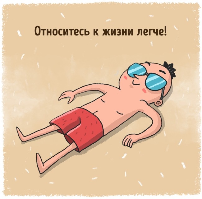 Перегляньте своє ставлення до себе і оточуючих. Найчастіше люди не хочуть вас ображати. А ви не зобов'язані відповідати власним суворим очікуванням. Ставитеся до світу легше і навчіться прощати. І ще важливо частіше думати про речі, які ви любите.