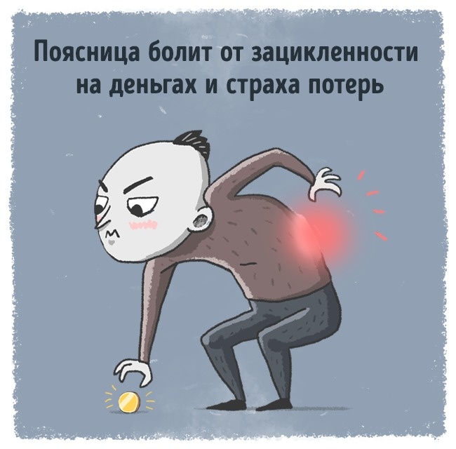 Якщо ми постійно турбуємося про гроші, у нас може боліти поперек. Можливо, власна таємна заздрість багатого життя ніяк не дає спокою або близькі постійно змушують переживати з приводу грошей.