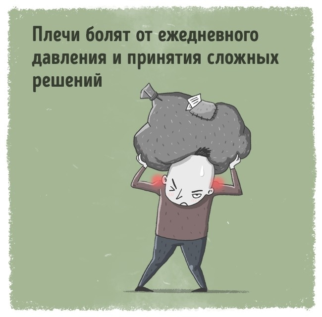 Біль в плечах говорить про те, що ми носимо важку емоційне навантаження, знаходимося під великим емоційним тиском. Можливо, хто-то в нашому оточенні тисне на нас. Або ми не можемо прийняти важливе рішення, і воно лежить на наших плечах тяжким тягарем.