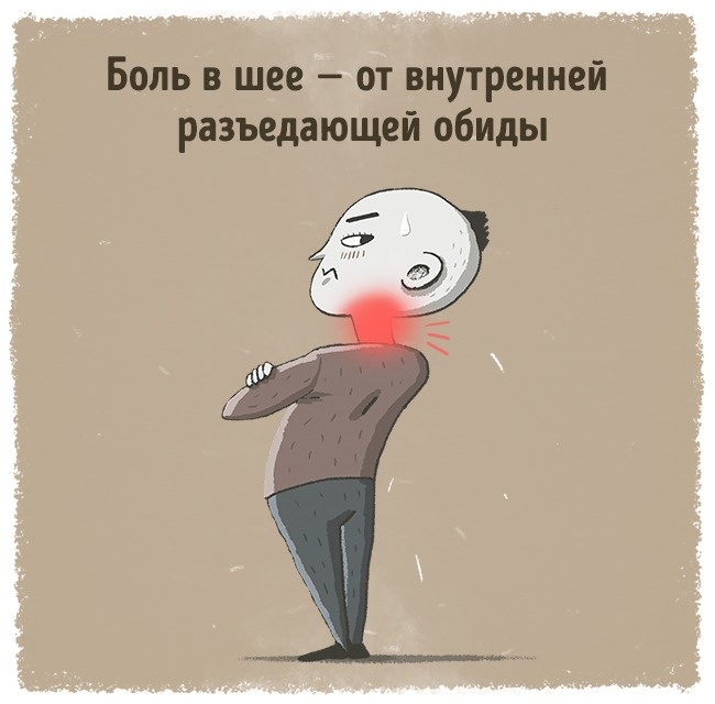 Дискомфорт в області шиї символізує вантаж образи на оточуючих, вантаж досади на власну недосконалість. Шия болить, коли ми не можемо пробачити когось або самого себе.