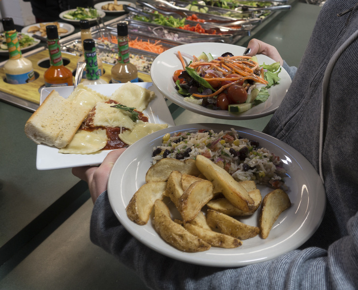 Цей прийом розрахований на те, що клієнти з'їдять побільше ситних вуглеводів і менше дорогого білка. Адже незручно затримувати чергу, намагаючись покласти в тарілку шматок лосося.