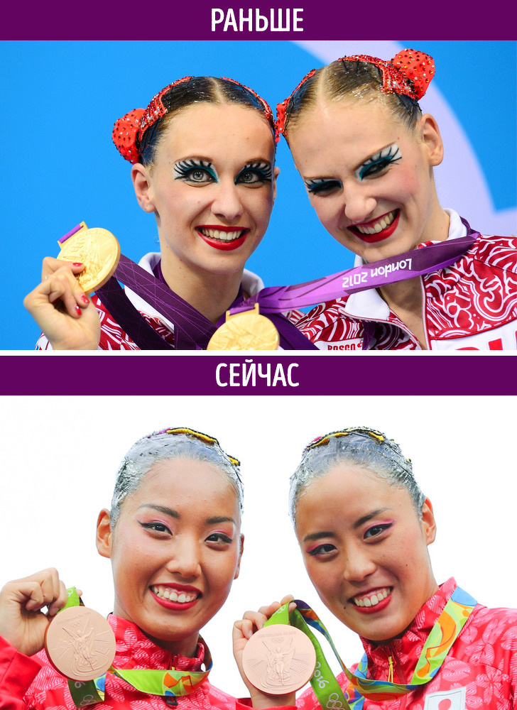Ще до недавнього часу синхроністки фарбувалися дуже яскраво: це було потрібно для того, щоб їх особи не губилися і емоції дівчат було видно глядачам. Однак кілька років тому спортсменкам заборонили робити яскравий макіяж, тому що він, на відміну від натурального, погано виглядає на екрані телевізора. Наталія Іщенко розповідала, що одного разу росіянкам довелося прати косметику прямо перед виступом, тому що їх мейкап здався комусь надто агресивним.