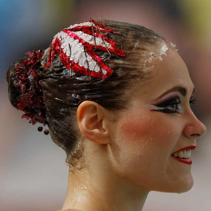 Зачіска — невід'ємна частина образу спортсменок, і вона повинна бути ідеальною. Для фіксації дівчата використовують не косметичні засоби, а звичайний харчовий желатин: вони перемішують його з водою і наносять на укладене волосся. Щоб видалити щільну плівку, особливо якщо після виступу проходить якийсь час, синхронисткам доводиться відмочувати волосся в дуже гарячій воді протягом одного, а то і двох годин.