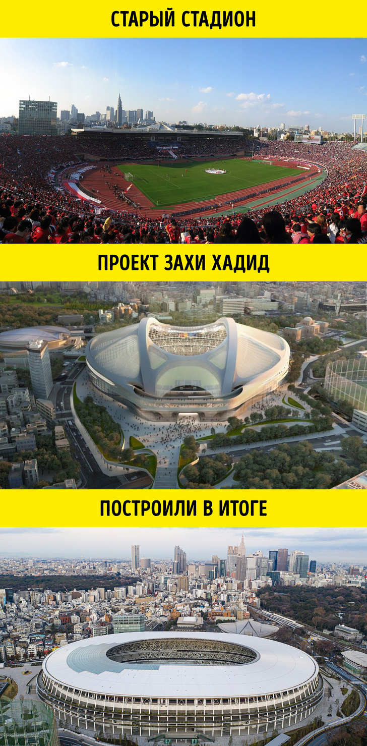 Спочатку стадіон повинні були будувати за проектом Захи Хадід, але після довгих дебатів його відхилили. Японський архітектор Арата Исозаки сказав, що стадіон, який спроектували в бюро Хадід, «схожий на черепаху, яка чекає, коли Японія потоне, щоб швидше відплисти звідти». Офіційною причиною відмови від проекту стала занадто висока вартість будівництва.