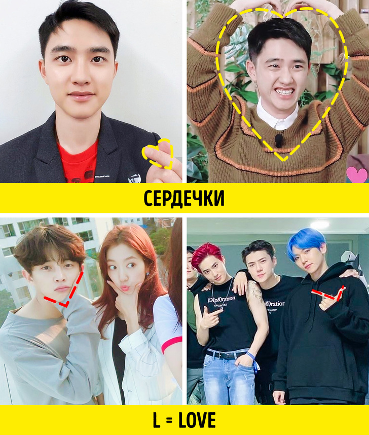 А тепер можна розібратися з жестами. Деякі з цих символів вам напевно вже доводилося бачити, але ви не знали, що вони позначають. По правді кажучи, жестова мова K-pop в основному використовується для того, щоб висловити симпатію мовця до кого б то не було. Подивіться, скільки різних способів вони придумали (так, відомого всім нам сердечку з складених долоньок доведеться потіснитися).