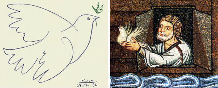 Прототипом голубки Пікассо став біблійний голуб, який під час Великого потопу приніс Ною звістка, що попереду суша.