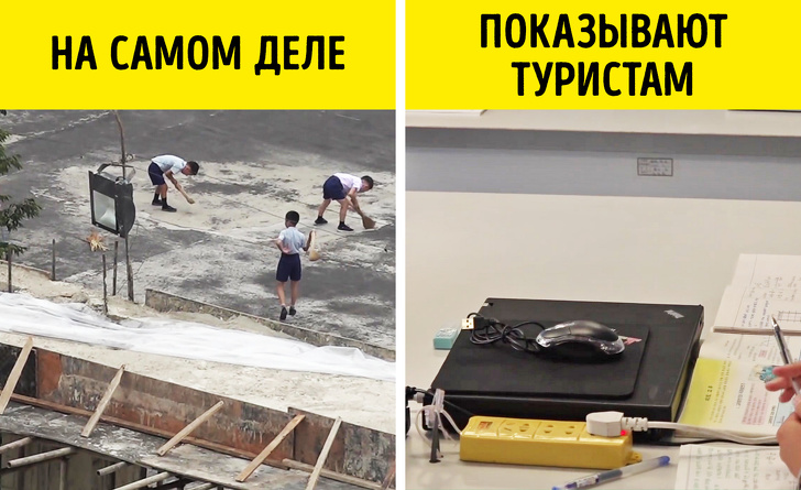 У звичайних школах в Північній Кореї дітей змушують прибирати територію перед уроками. Туристам показують зовсім інші школи. Там діти займаються за ноутбуками, до більшості з яких навіть не підключені ні мишки, ні дроти живлення.