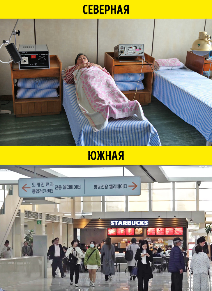 В лікарняній палаті в Пхеньяні часто коштує ліжко і невеликий стіл. Лікарні в Сеулі виглядають як сучасні торгові центри, кафе, електронними табло і магазинами. Громадяни Південної Кореї при цьому платять за державну і за комерційну страховку, тому що перша покриває не всі.