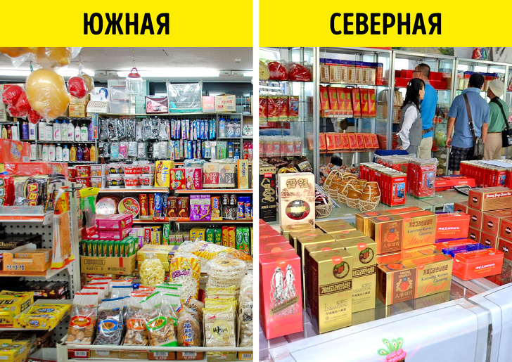 Якщо порівнювати магазини Сеула і супермаркет, в який привозять туристів в Пхеньяні, то відмінностей мало. При вході в північнокорейський магазин навіть караоке є. Різниця в цінах при цьому суттєво відчутна: всі продукти в Північній Кореї, особливо у маленьких магазинах і кіосках для місцевих, дуже дешеві. Крім того, є привілей у вигляді видачі продуктів за картками для робітників стратегічних галузей.
