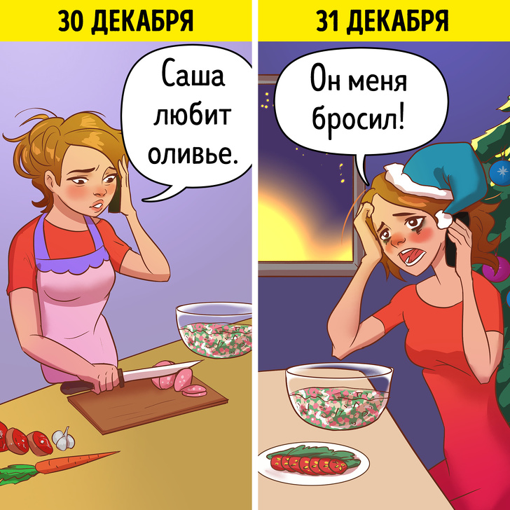 Сама сумна частина свята — ранок 1 січня. Ще вчора було стільки надій, подарунків, очікування змін, феєрверків і бризок шампанського, а сьогодні — розуміння того, що насправді нічого не змінилося, від шампанського похмілля, від салютів і хлопавок — сміття на порожніх вулицях, а подарунки — це в кращому випадку делеговані покупки. І ще треба заплатити за інтернет, і салати доїсти. Емоційна спустошеність від Нового року порівнянна хіба що з порожнечею в гаманці.