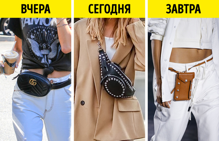 Ще один тренд (як і шпильки, і авоськи) родом з 90-х. Він почав здавати свої позиції ще влітку, і спочатку стилісти запропонували їх носити через плече, а тепер радять спробувати сумки різних форм. Наприклад, невеликі прямокутні під смартфон, кілька невеликих сумок на ремені, у формі сідла та інших.