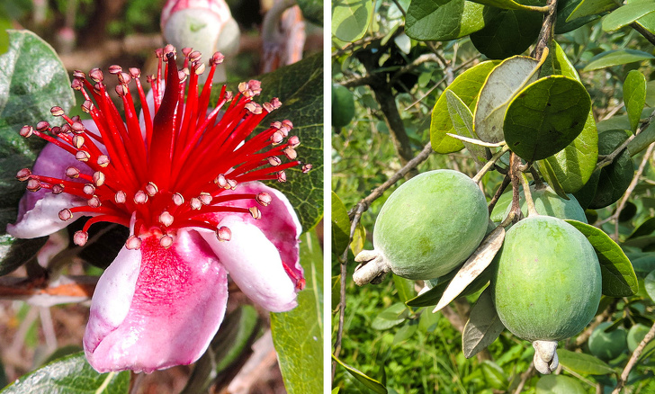 - Фейхоа містять багато йоду, цинку, вітаміни С та B, тому ці плоди корисні для пам'яті, збільшують працездатність, сприяють здоров'ю волосся і нігтів, підвищують імунітет.