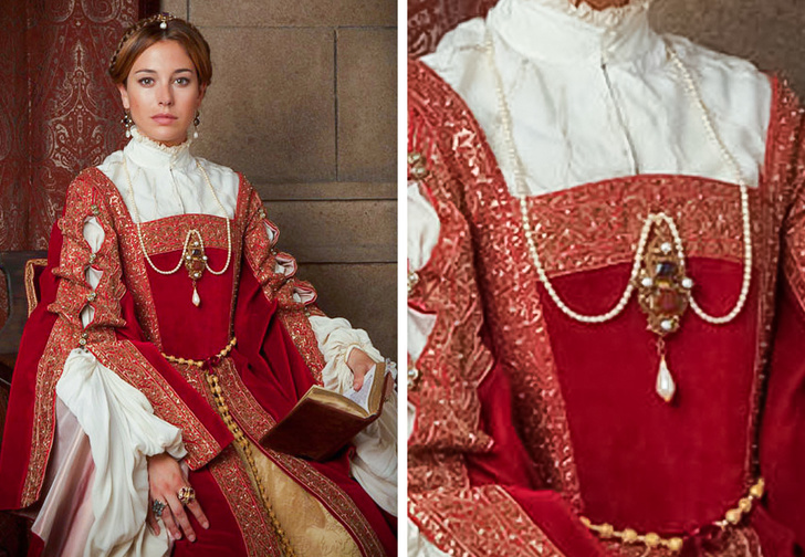 З плюсів: сукня на дамі з корсетом сиділо ідеально, його дорога тканина не м'ялася й не створювала зайвих складок. Є припущення, що дами того часу придумали носити намисто таким способом, як на картинці вище, щоб показати, що груди у них все-таки є.