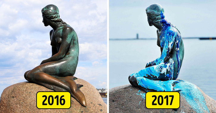 Скульптуру створив Едвард Еріксен в 1909 році, але ми вже кілька разів встигли втратити пам'ятник за його порівняно недовгу історію. Двічі прекрасну Русалочку позбавляли голови, один раз — руки. Незліченну кількість разів її покривали фарбою і графіті.