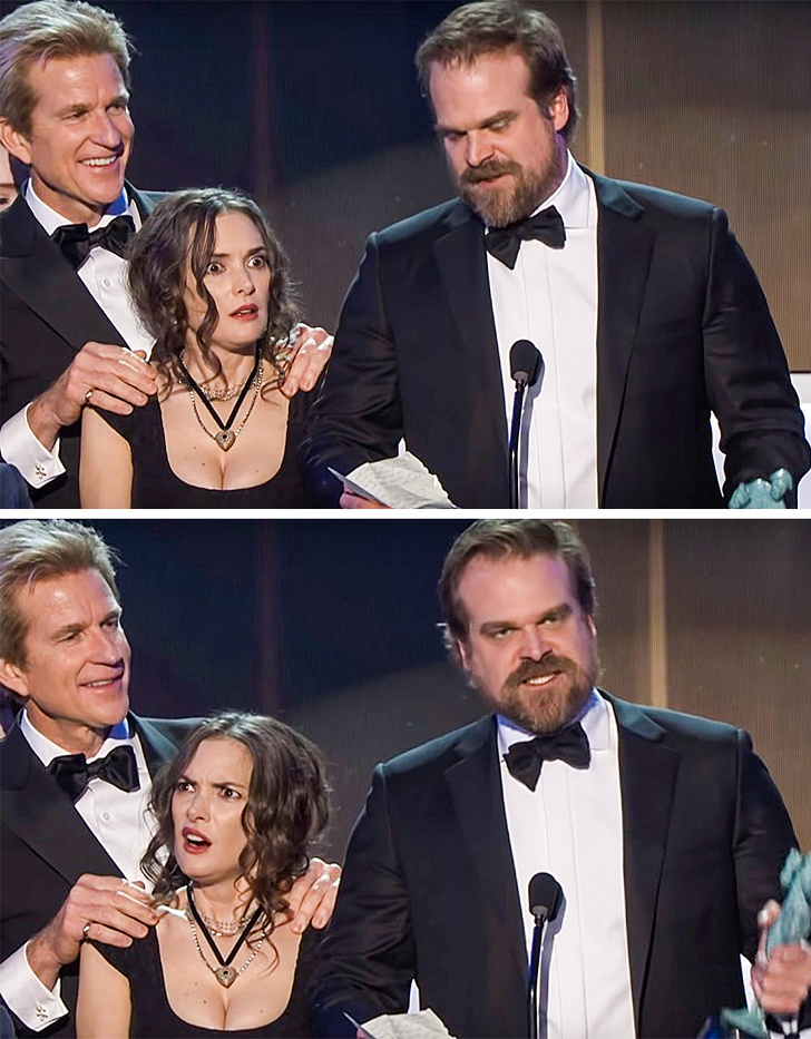 Команда серіалу «Дуже дивні справи» в 2017 році отримала премію Гільдії кіноакторів США в номінації «Кращий акторський склад в драматичному серіалі». Всі учасники нагородження просто кипіли від емоцій, але справжній фурор справила саме Райдер. За весь час, що її колега Девід Харбор виголошував промову, актриса дивним чином постійно змінювалася в особі. Цю карусель емоцій користувачі мережі порахували кращим подією премії і розхапали по шматках на гифки і фотожаби.