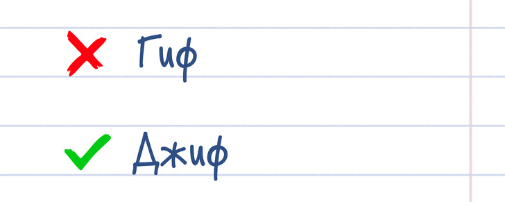Всі ми час від часу обмінюємося зі своїми друзями і близькими барвистими і смішними гифками. Але правильна назва формату зображень звучить як «джиф». GIF — скорочення від Graphics Interchange Format (формат для обміну зображеннями»), і якщо вимовляти його як абревіатуру, то виходить «гіф»; тут і криються корені звичного нам варіанти вимови.