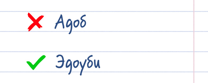 Назва популярного графічного редактора масово вимовляють неправильно. Справа в тому, що спочатку adobe — іспанське слово, що означає «цегла, зроблений з глини і соломи». А загальноприйнята вимова для нього — «эдоуби», і ніяк інакше. Як же це пов'язано з компанією-розробником програмного забезпечення? Джон Уорнок, засновник бренду, жив у Каліфорнії неподалік від місця під назвою Adobe Creek (Глиняна річка), звідси і пішла назва компанії.